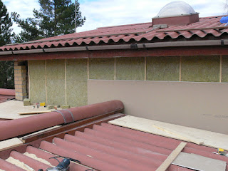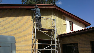 Mineraalivillaa tiilen sijaan ja uudet tuulensuojat päälle ja vielä rimoitus pintalaudoitukselle.